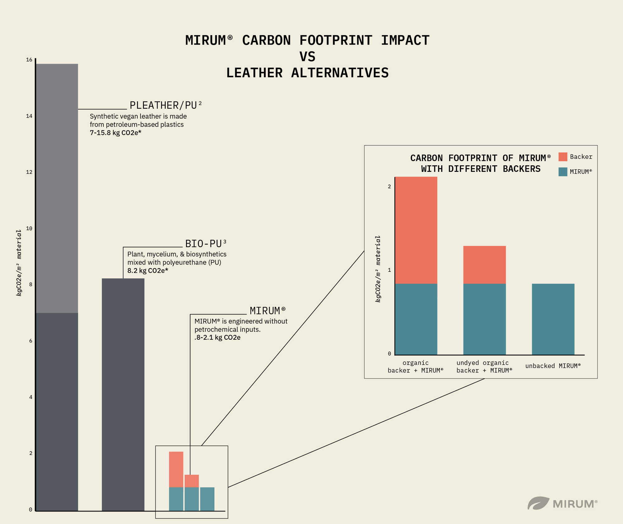MIRUM®は、5kg Co2e/kg以下で生産することが可能となっており、これは植物由来のヴィーガンレザーの中でもかなり低いCFP(カーボンフット」プリント)であり、まさに理想的なバイオレザーです。